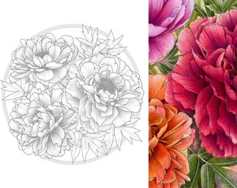 Peony coloring page to color, print or download. A) draw a coloring page! One clear digital stamp you will get: Peony coloring page for grownups adults dark,light & sepia grayscale all in one! It's easy to download and use.